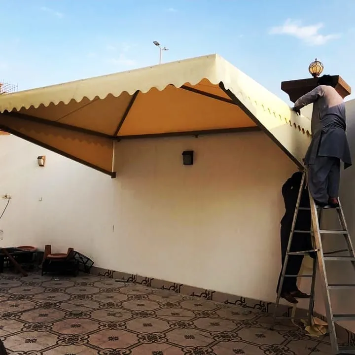 - شدادات الضغط: في المظلات الكبيرة، يفضل إضافة شدادات جانبية لامتصاص اهتزازات الرياح العاتية.