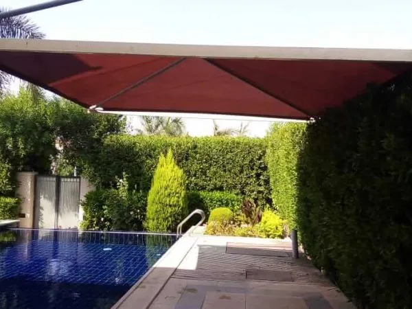 - خلق مساحات جلوس باردة: في الفيلات، توفر المظلات ظلاً مثالياً للحدائق والمسابح، مما يتيح لك الاستمتاع بالهواء الطلق في أي وقت.