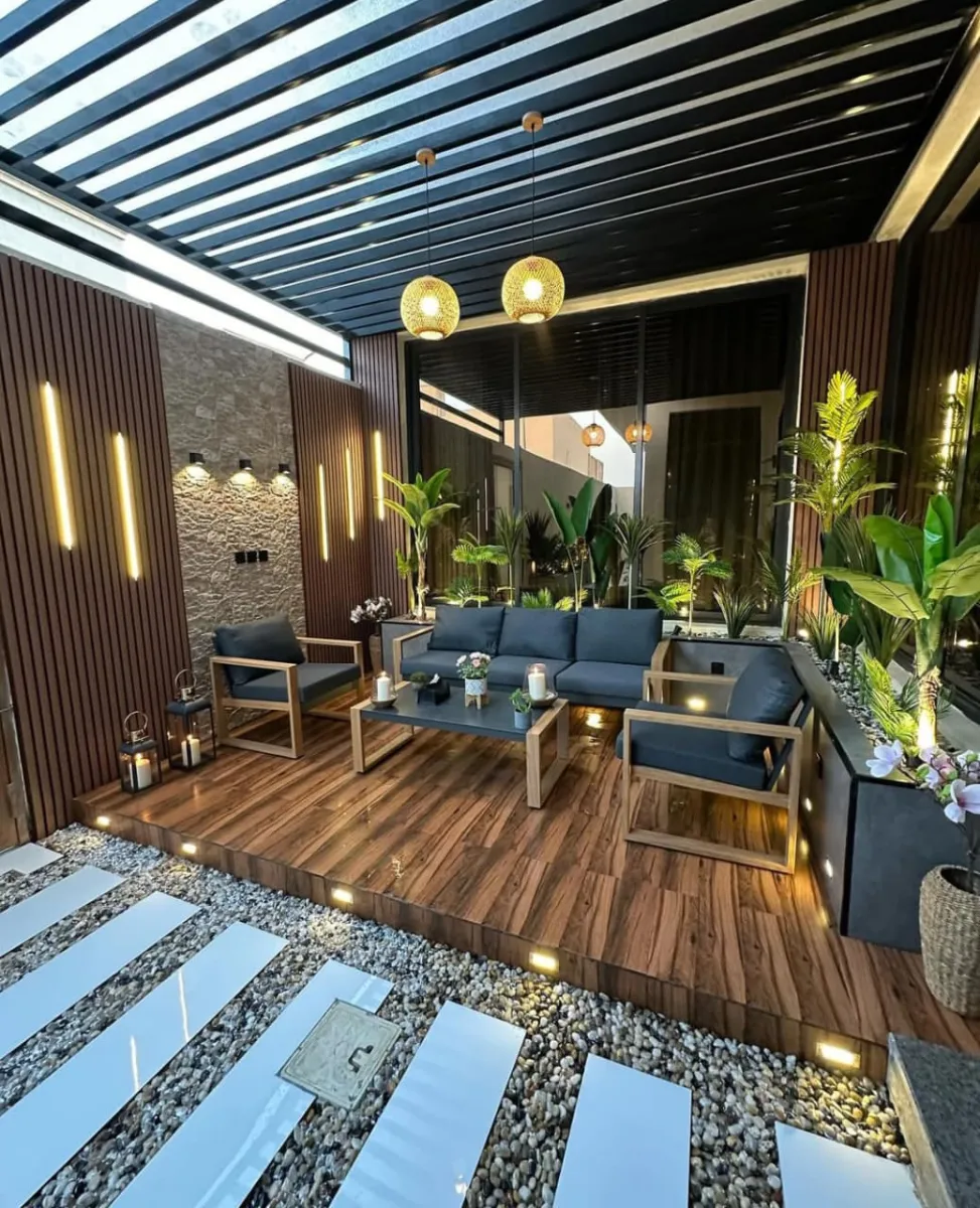 للحصول على جلسة خارجية مميزة، يجب مراعاة التوازن بين الأثاث، الإضاءة، والمساحة الخضراء. إليك أبرز التوجهات الحالية:
