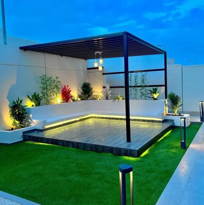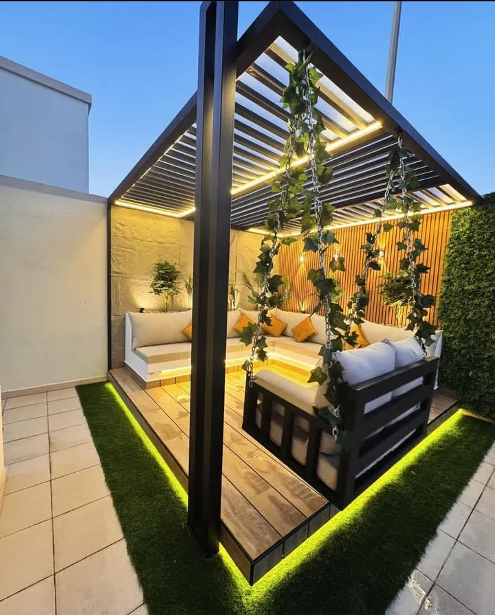 - المظلات الخشبية (البرجولات): تعطي لمسة كلاسيكية فخمة، ويُفضل استخدام الخشب المعالج أو "الليوود" لمقاومة النمل الأبيض والتآكل.