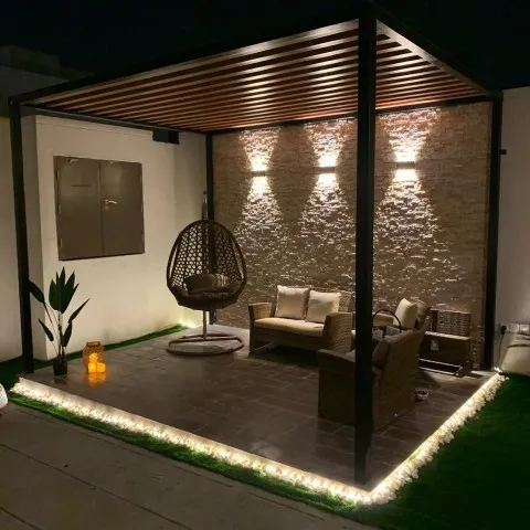 - المظلات المتحركة (الكهربائية): الخيار الأكثر ذكاءً، حيث يمكنك التحكم في فتحها وإغلاقها عبر الريموت كنترول، وهي مثالية للجلسات التي تحتاج لمرونة في الإضاءة والتهوية.