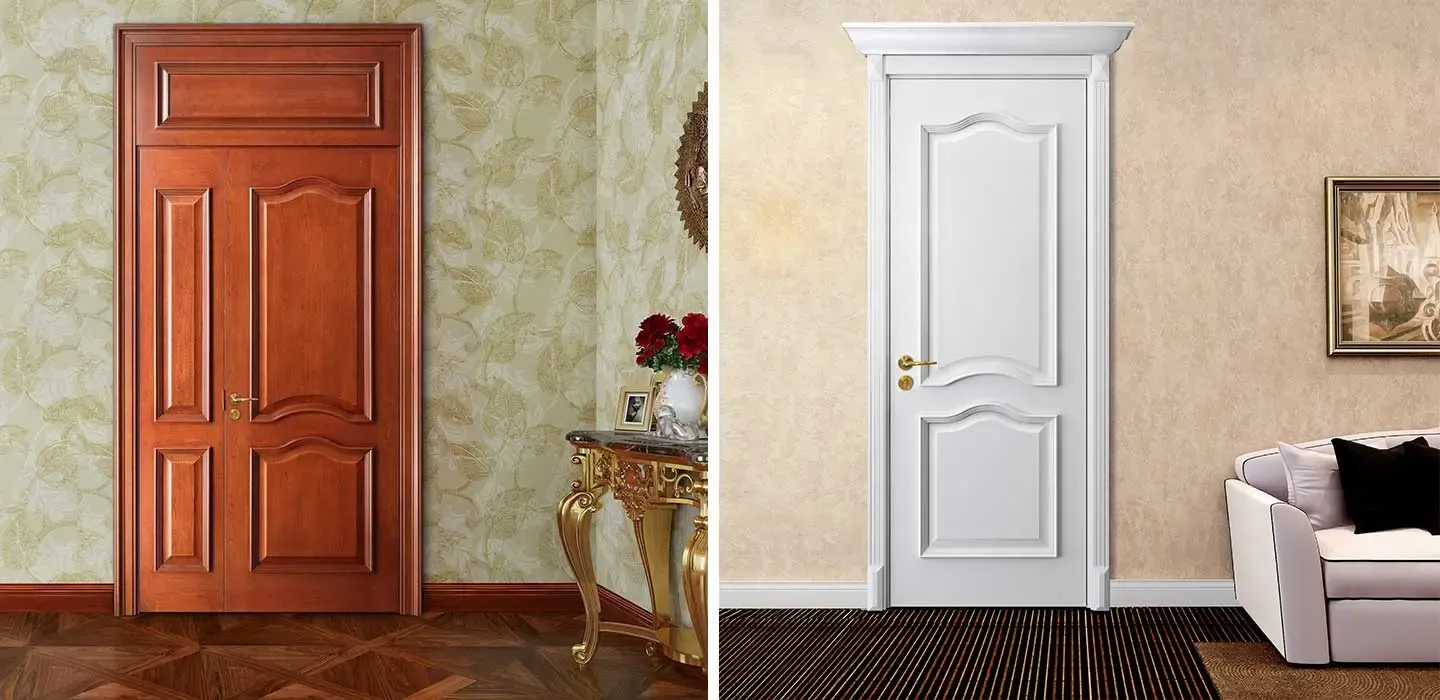 - خشب اصلي: معروف بمتانته ونعومة ملمسه، وهو خيار مثالي للأبواب التي تتطلب دهانات "لاكيه" أو ألواناً فاتحة.