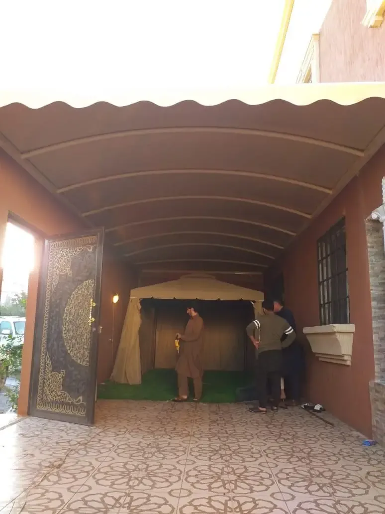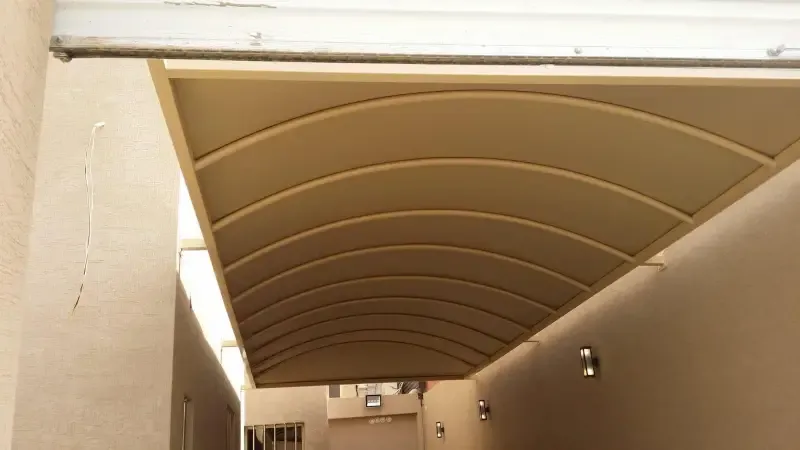 - حماية من العوامل الجوية القاسية: توفر المظلات حاجزًا فعالاً ضد أشعة الشمس الحارقة ☀️ في الصيف، وتحمي المدخل من الأمطار الغزيرة 🌧️ والأتربة، مما يطيل عمر الأبواب ويحافظ على نظافة المنطقة.