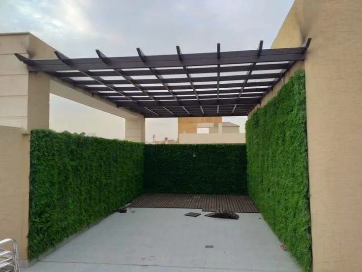 - توافق التصميم مع واجهة المنزل 📐: يجب أن يكون شكل المظلة ولونها متناسقًا مع طراز الفيلا الخارجي. فمثلاً، الواجهات الزجاجية الحديثة يناسبها اللكسان أو الحديد بتصاميم مودرن، بينما الواجهات الحجرية الكلاسيكية يفضل لها الخشب أو القرميد.