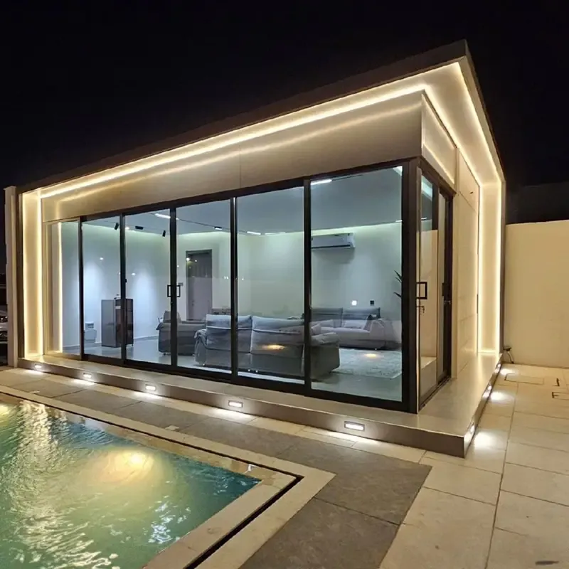 - الإنارة المسائية المُدروسة: الاعتماد على إضاءة محيطية خافتة ومصابيح أرضية لإبراز جمال الزجاج والإطلالة دون التسبب في انعكاسات مزعجة.💡