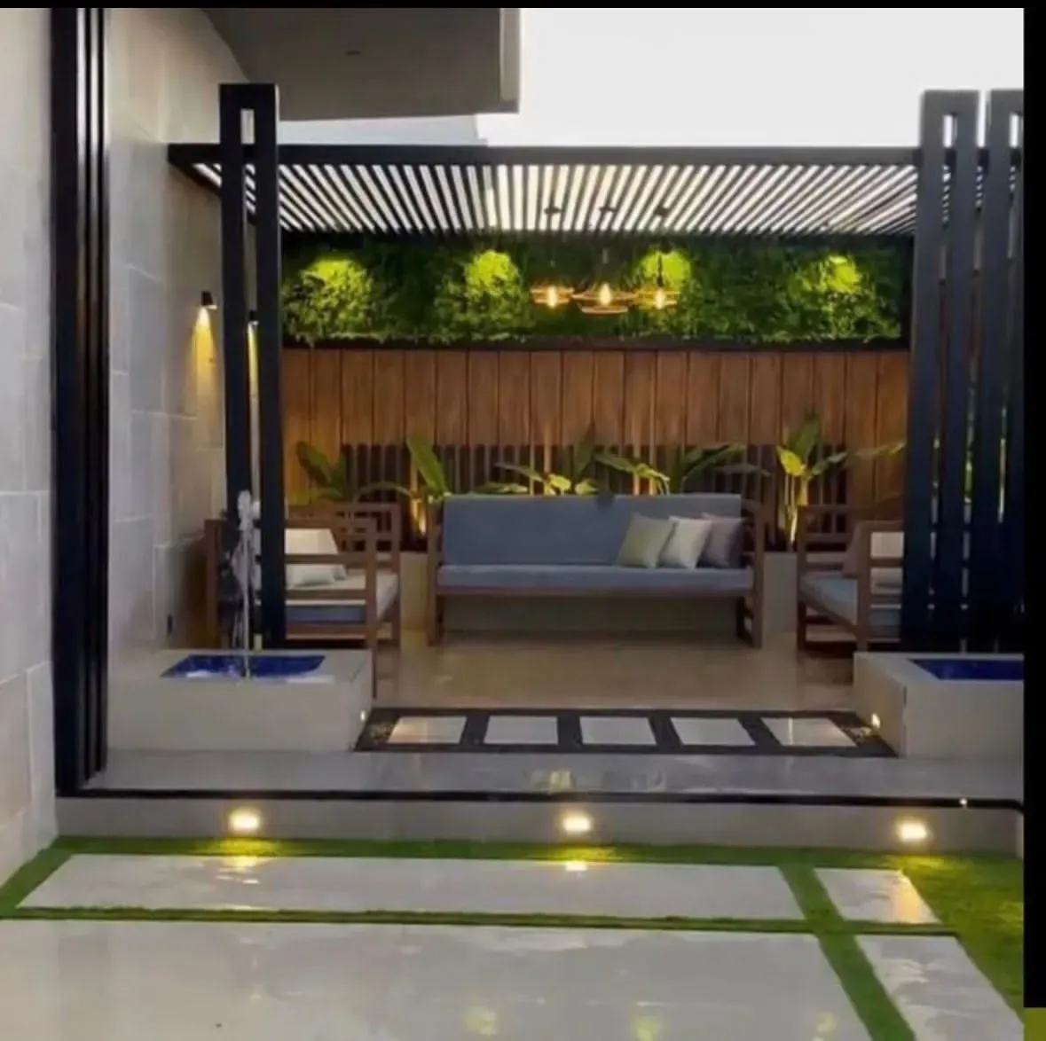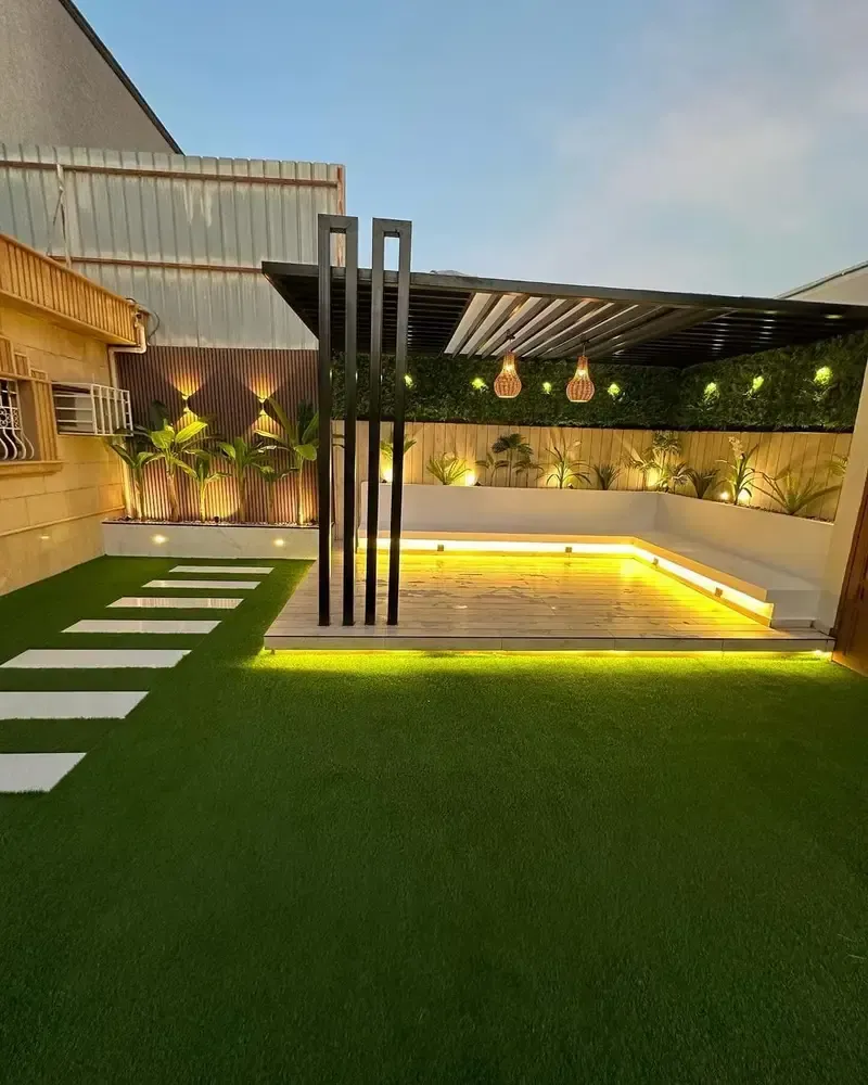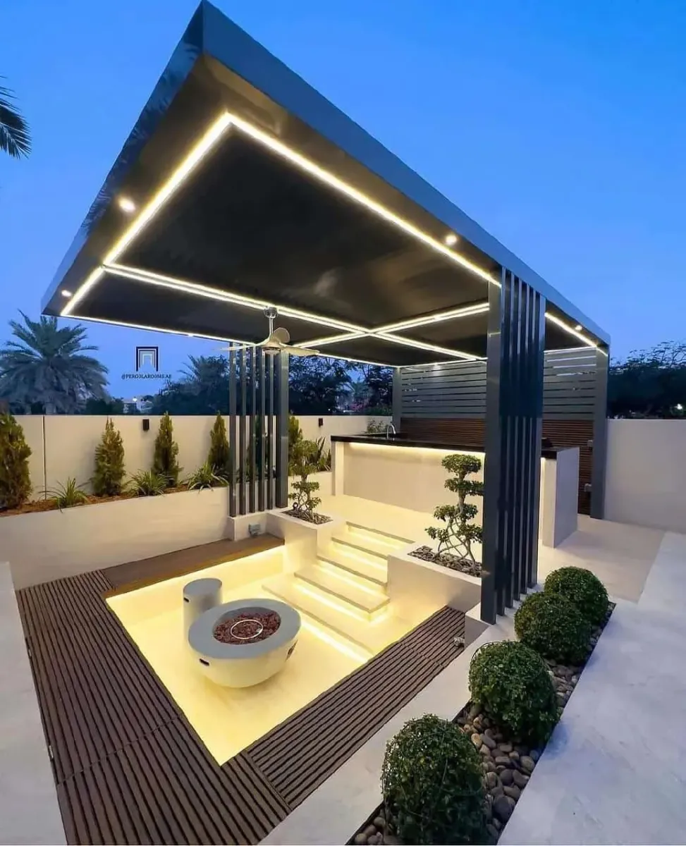 - الإضاءة الديناميكية: استخدام شرائط LED مخفية داخل إطارات البرجولات، مع إمكانية تغيير درجة حرارة اللون(من الأبيض الدافئ إلى البارد) لتناسب الأجواء المسائية أو وظيفة الجلسة.