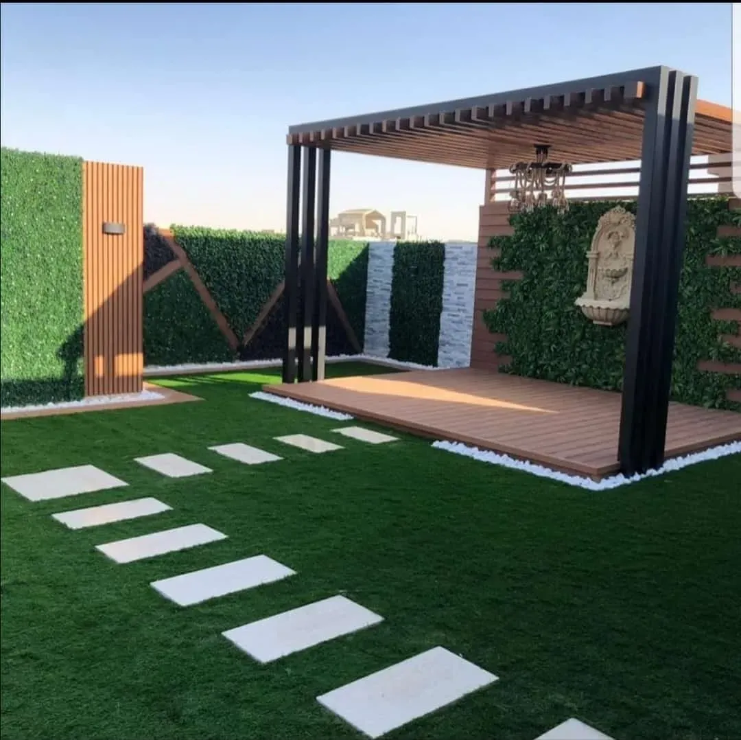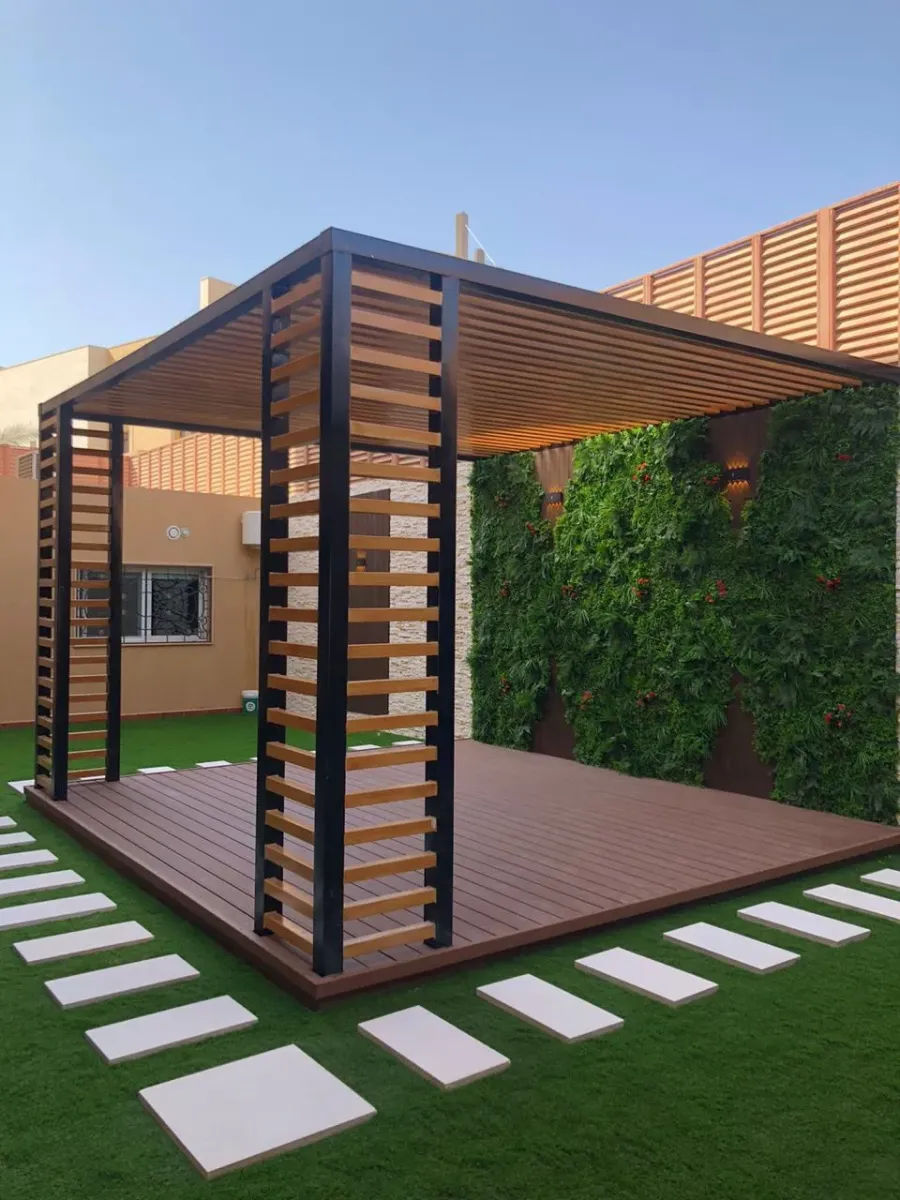 - الخشب البلاستيكي المركب: يظل الخشب البلاستيكي خياراً رائجاً للبرجولات، حيث يوفر المظهر الدافئ للطبيعةدون الحاجة إلى المعالجة الدورية التي يتطلبها الخشب الطبيعي.