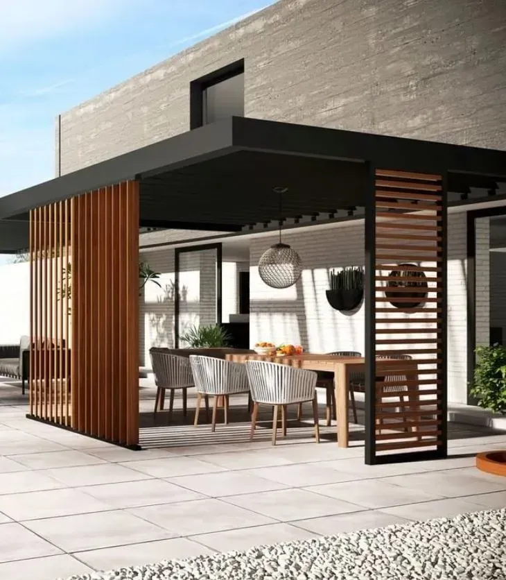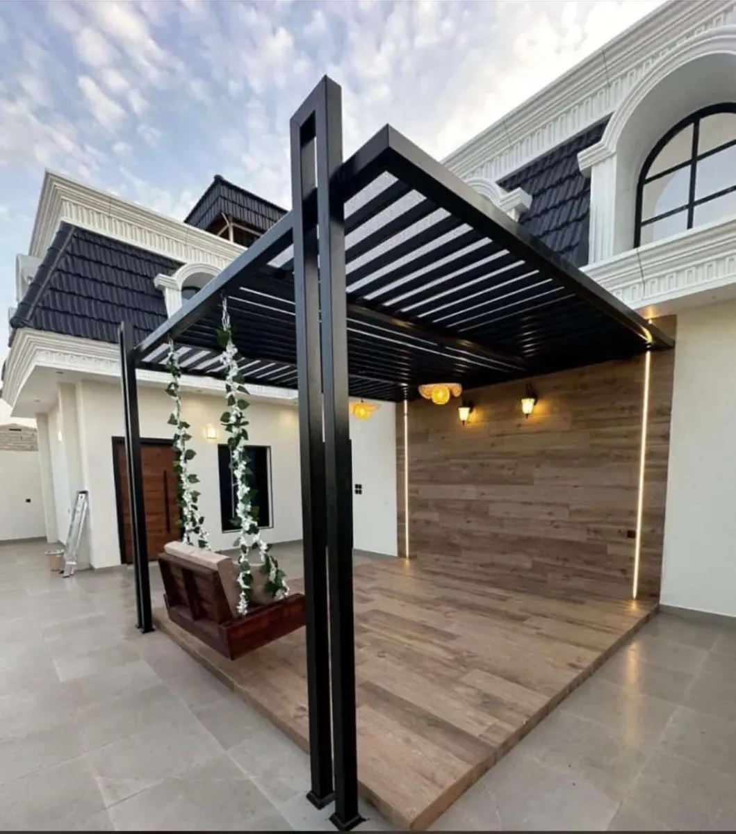 - الاندماج المعماري: تتجه التصاميم الحديثة نحو أن تكون البرجولات امتداداً عضوياً للمبنى، وليس مجرد إضافة لاحقة. ويظهر ذلك في استخدام خطوط تصميم بسيطة ونظيفةوألوان محايدة (الرمادي الداكن، الأسود المطفأ، البيج).