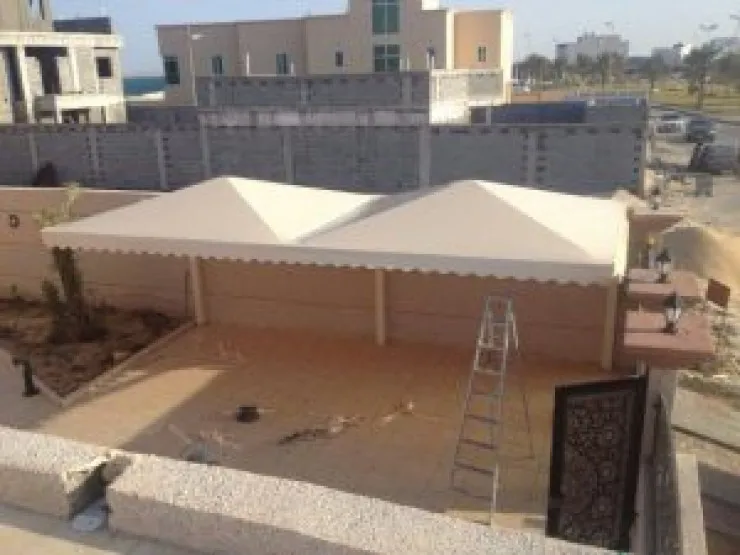 - مادة التغطية: التركيز على قماش الـ PVC الألماني والكوري المقاوم للحريق، والذي يتميز بمرونته وقوته، بالإضافة إلى البولي كربونات (اللكسان) الشفاف أو الملون للمسة جمالية عصرية.