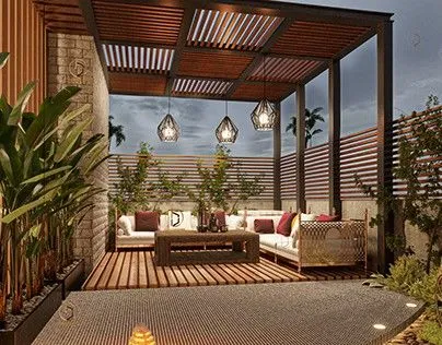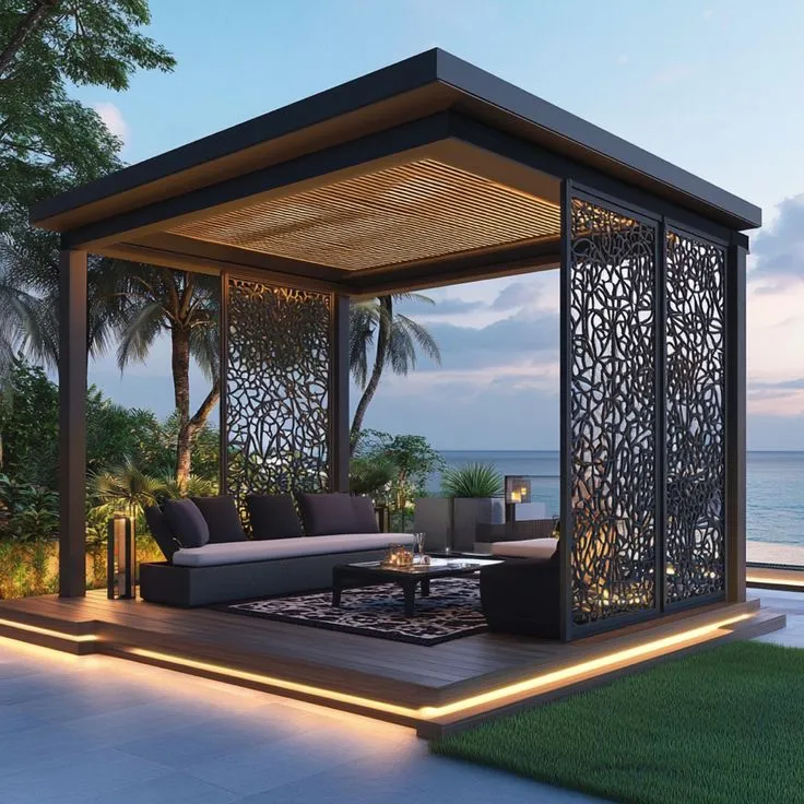 - برجولات حديدية: بتصاميم تشبه الخشب (دهانات خشبية) لدمج الصلابة مع الشكل الجمالي.