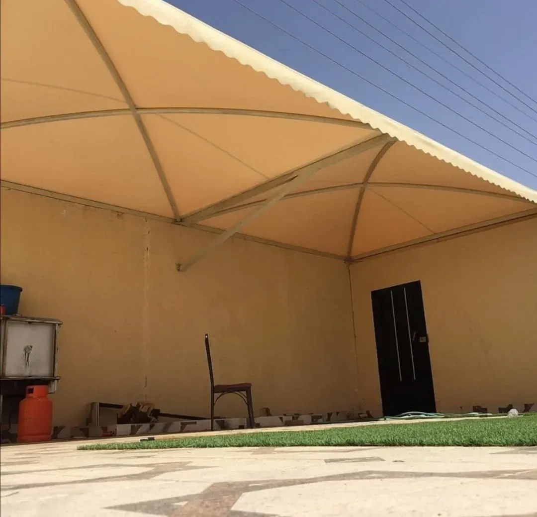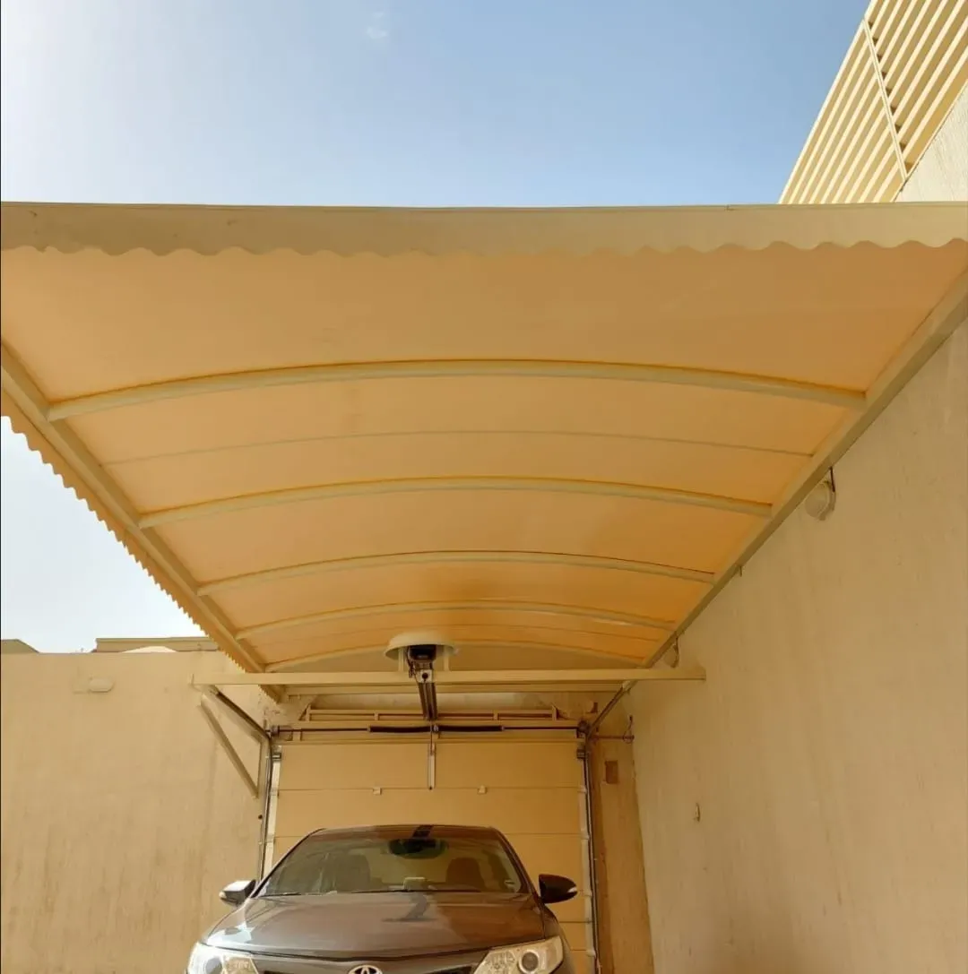 - مظلات القماش (PVC): خيار عملي واقتصادي، يتميز بالمتانة العالية وسهولة التنظيف وتعدد الألوان.